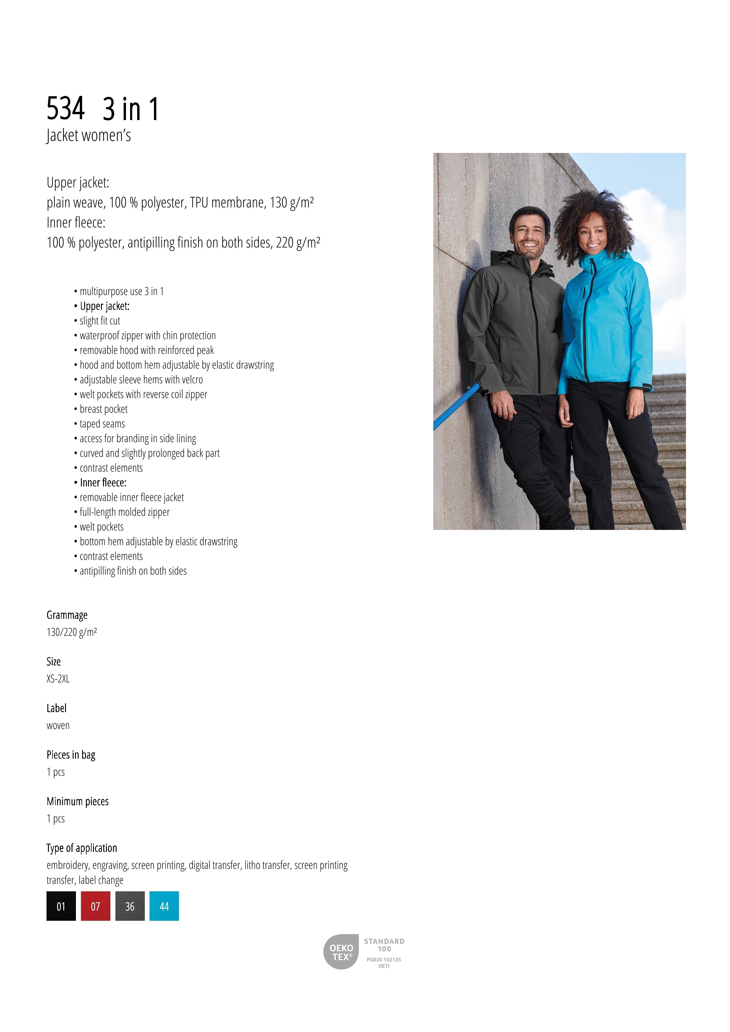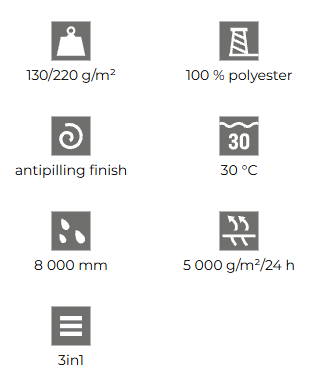 - waterdicht 8.000 mm, ademend 5.000 g/m²/24 h.