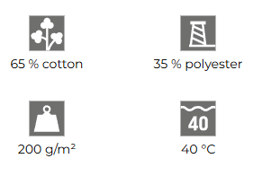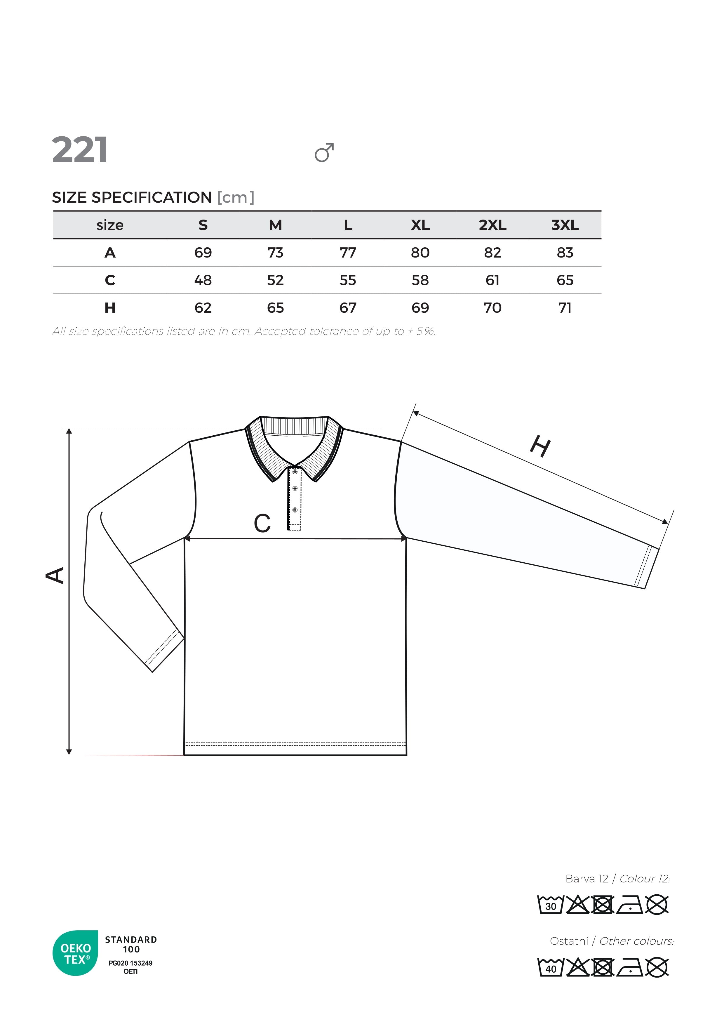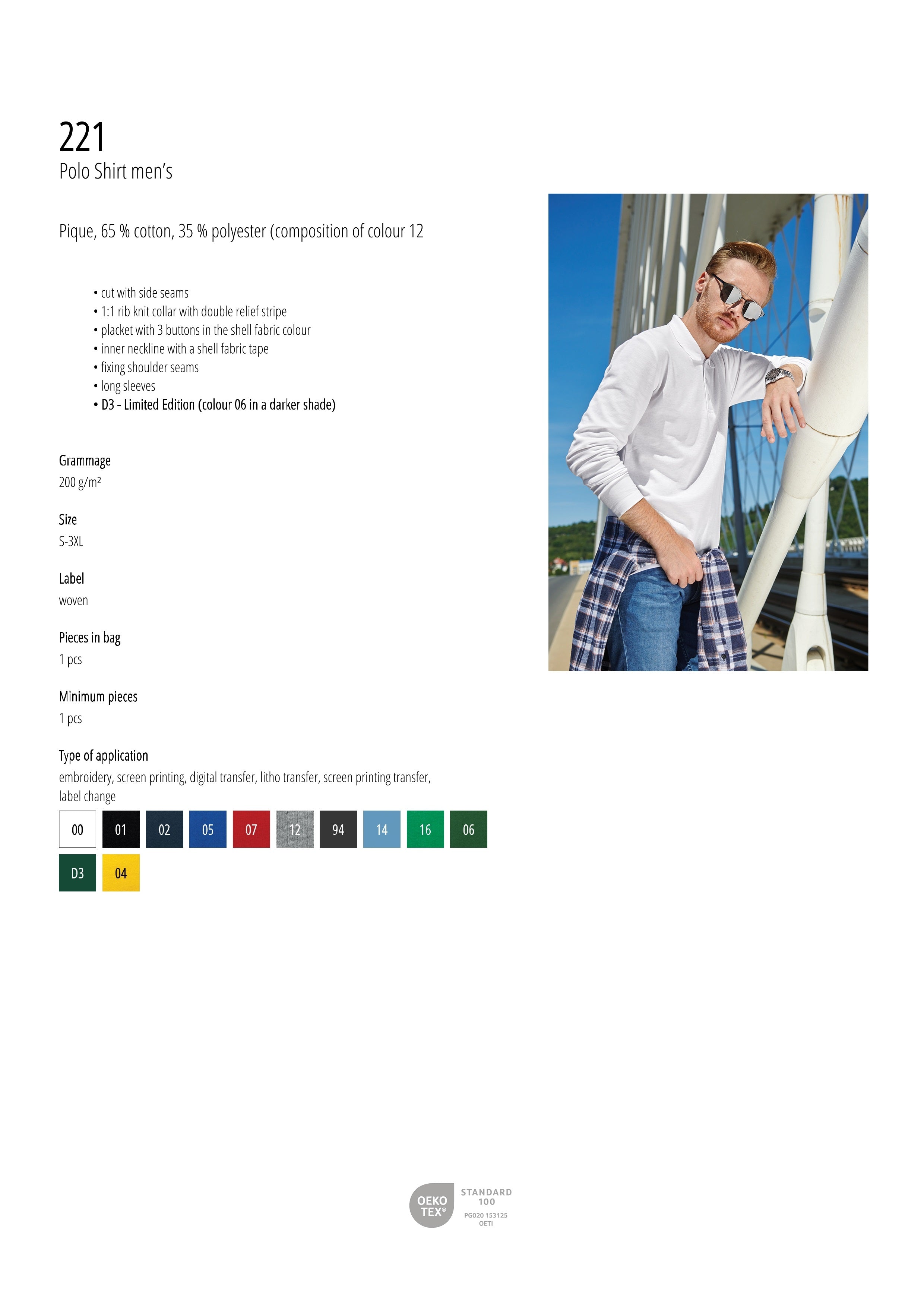 - Piqué, 65% katoen, 35% polyester (samenstelling van kleur 12 kan afwijken – 85% katoen, 15% viscose)