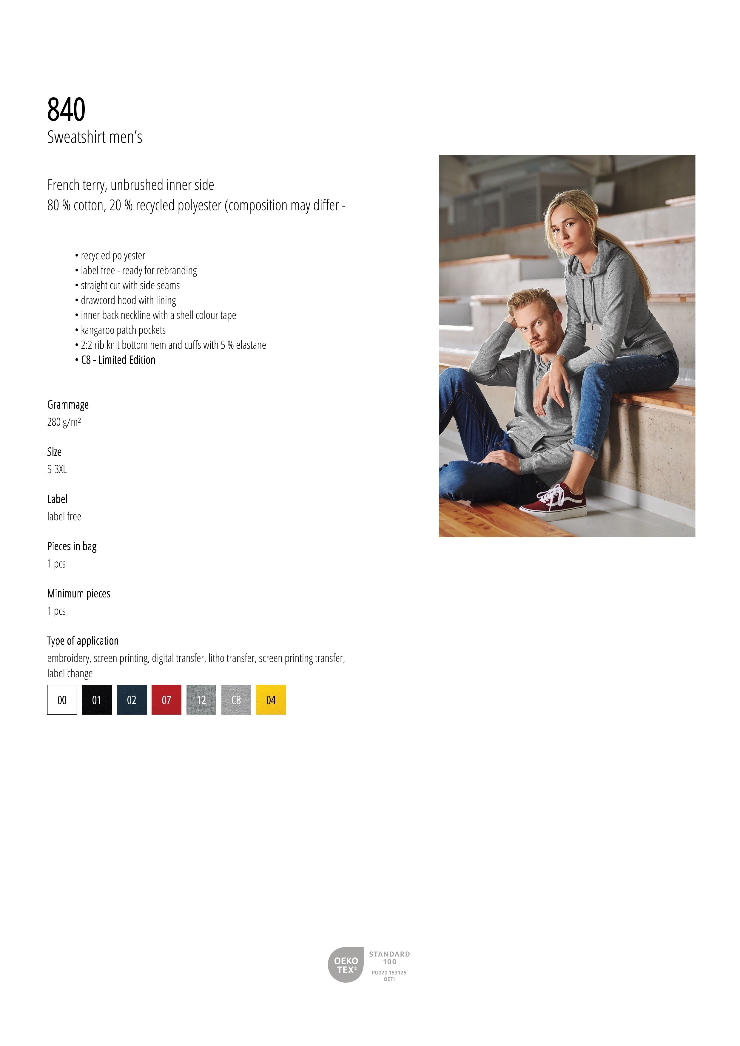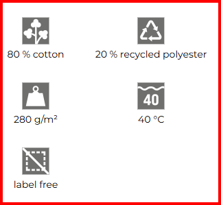 - 80% katoen, 20% gerecycled polyester (samenstelling kan afwijken - kleur 12 – 70% katoen, 30% gerecycled polyester)
