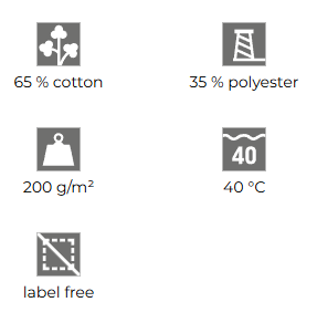 • 65 % katoen, 35 % polyester (samenstelling van kleur 12 kan afwijken – 85 % katoen, 15 % viscose)