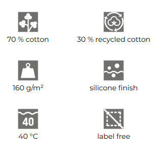 • 70% katoen, 30% gerecycled katoen, siliconen afwerking