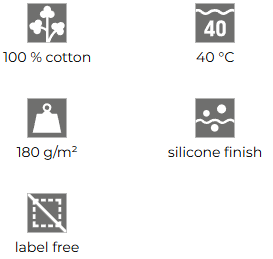 - 100% katoen (samenstelling van kleur 12 kan afwijken – 85% katoen, 15% viscose), siliconen afwerking