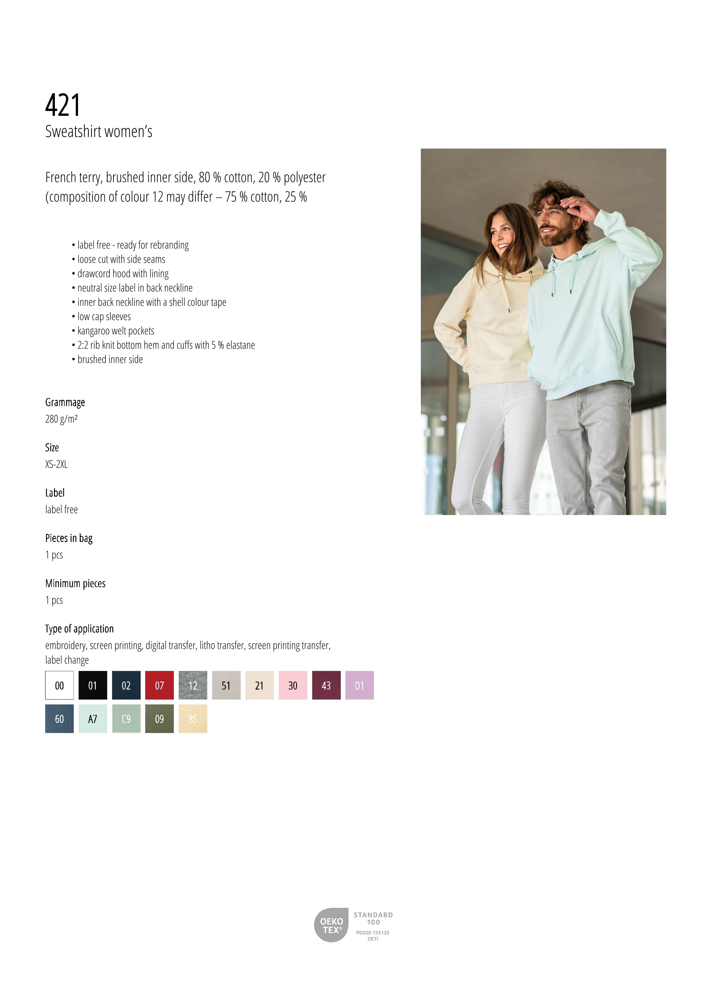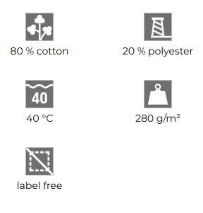 • Franse badstof, geborstelde binnenkant, 80% katoen, 20% polyester (samenstelling van kleur 12 kan afwijken – 75% katoen, 25% viscose)